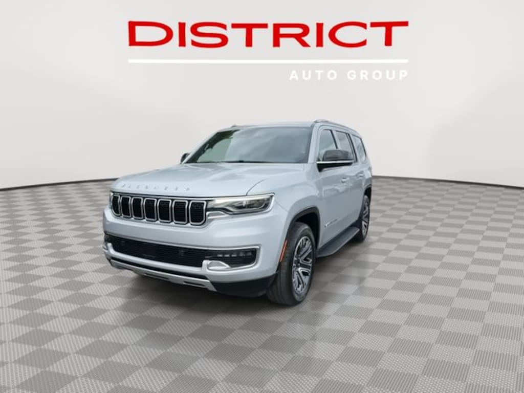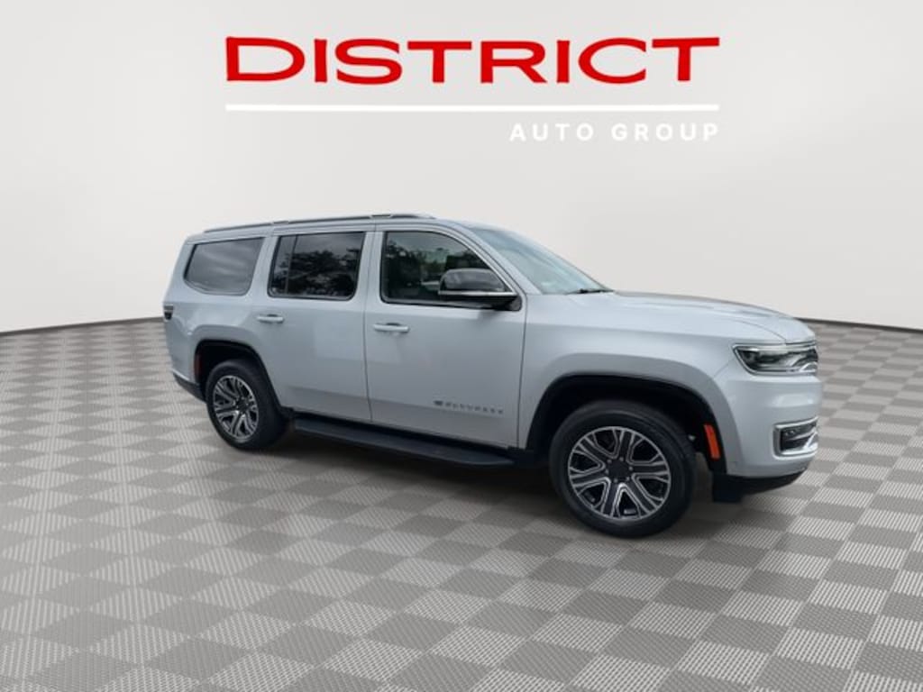 CARFAX One-Owner. 3.55 Rear Axle Ratio, Air Conditioning, Alloy wheels, Anti-whiplash front head restraints, Apple CarPlay/Android Auto, Audio memory, Auto-dimming door mirrors, Auto-dimming Rear-View mirror, Auto-leveling suspension, Automatic temperature control, Brake assist, Bumpers: body-color, Compass, Delay-off headlights, Driver door bin, Driver vanity mirror, Driver's Seat Mounted Armrest, Dual front impact airbags, Dual front side impact airbags, Electronic Stability Control, Exterior Parking Camera Rear, Four wheel independent suspension, Front anti-roll bar, Front Bucket Seats, Front dual zone A/C, Front fog lights, Front reading lights, Fully automatic headlights, Genuine wood console insert, Genuine wood dashboard insert, Genuine wood door panel insert, Heated door mirrors, Heated steering wheel, Knee airbag, Leather Trimmed Bucket Seats, Low tire pressure warning, Navigation System, Normal Duty Suspension, Overhead airbag, Panic alarm, Pedal memory, Power adjustable front head restraints, Power door mirrors, Power driver seat, Power Liftgate, Power passenger seat, Power steering, Quick Order Package 25J, Radio data system, Radio: Uconnect 5 Nav w/10.1" Display, Rain sensing wipers, Rear air conditioning, Rear dual zone A/C, Rear window defroster, Rear window wiper, Reclining 3rd row seat, Remote keyless entry, Security system, Speed control, Speed-sensing steering, Speed-Sensitive Wipers, Split folding rear seat, Steering wheel memory, Steering wheel mounted audio controls, Traction control, Turn signal indicator mirrors, Variably intermittent wipers, Ventilated front seats, Wheels: 20" x 9.0" Premium 2 Aluminum. 2024 Jeep Wagoneer Series II Silver Zynith RWD 8-Speed Automatic 3.0L I6 17/24 City/Highway MPG